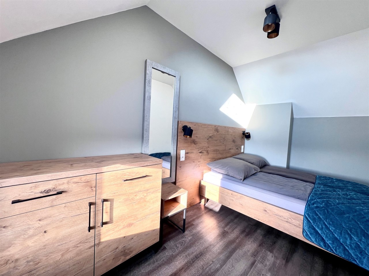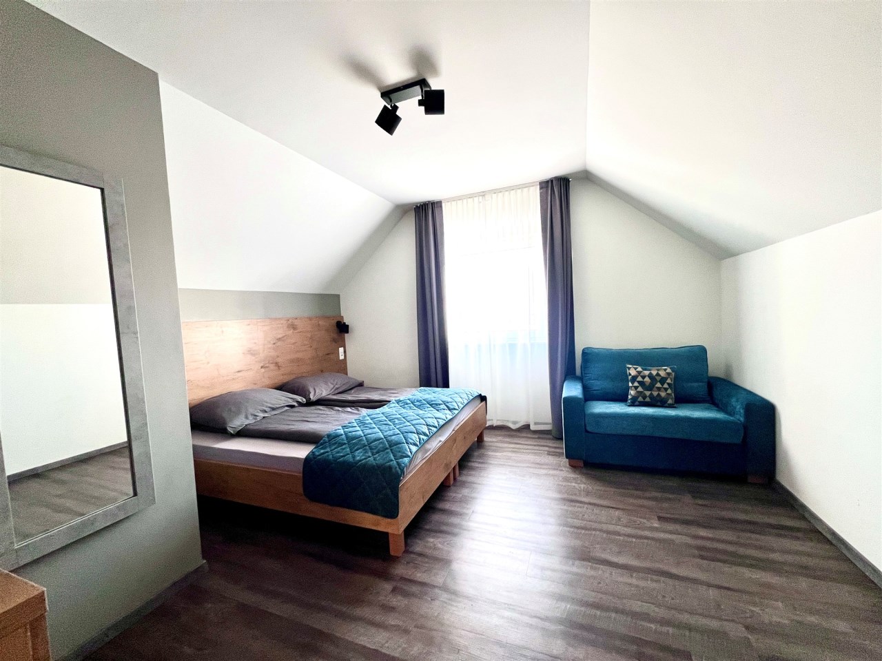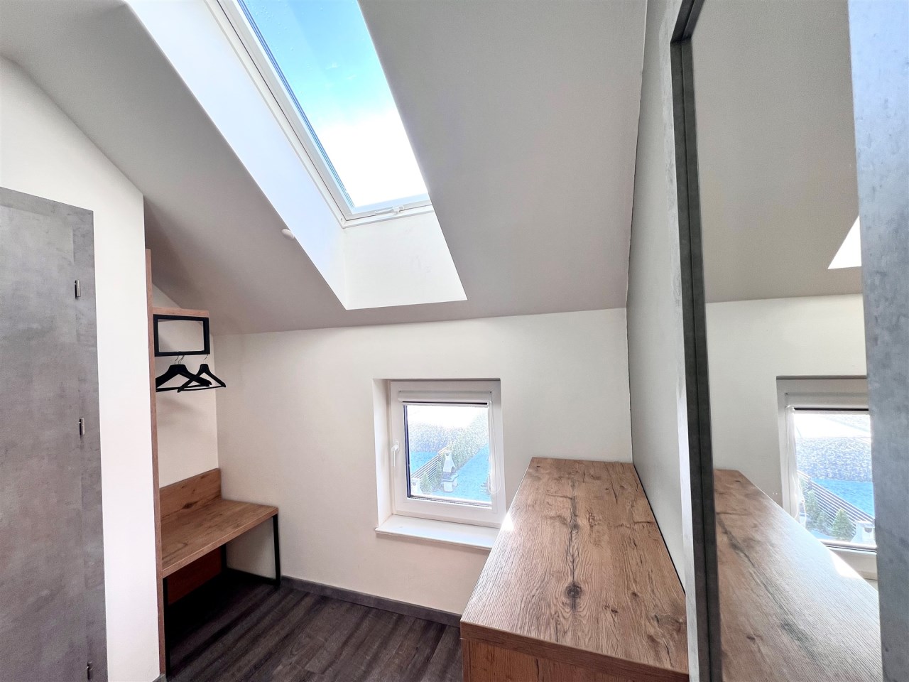 Apartament składa się z dwóch poziomów. Na parterze znajduje się obszerny salon z aneksem kuchennym oraz łazienka, natomiast na piętrze czekają dwie przytulne sypialnie, zapewniające komfortowy wypoczynek. Całość jest w pełni umeblowana i wyposażona – możesz od razu wprowadzić się lub rozpocząć wynajem bez dodatkowych inwestycji.