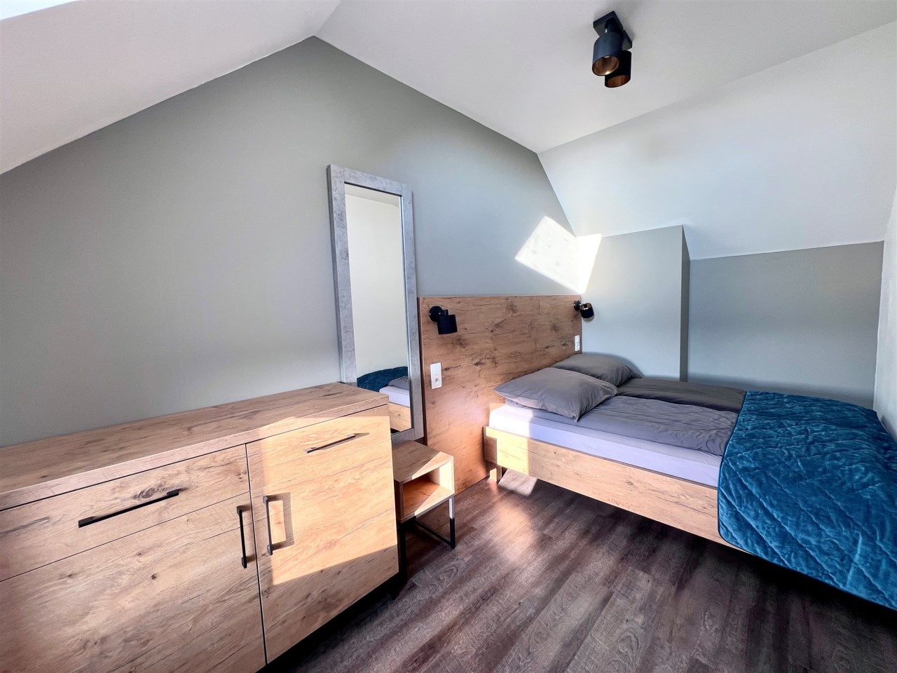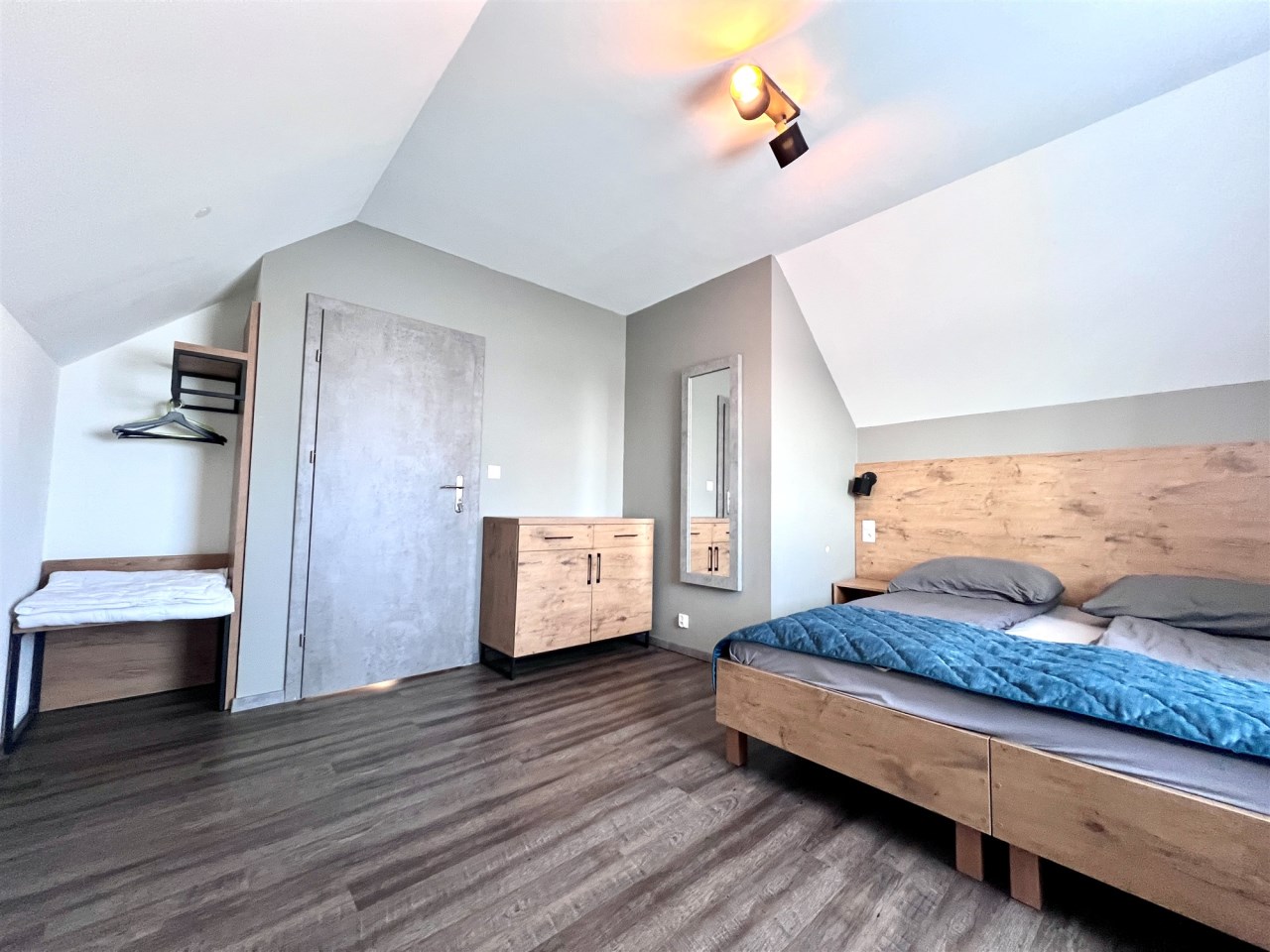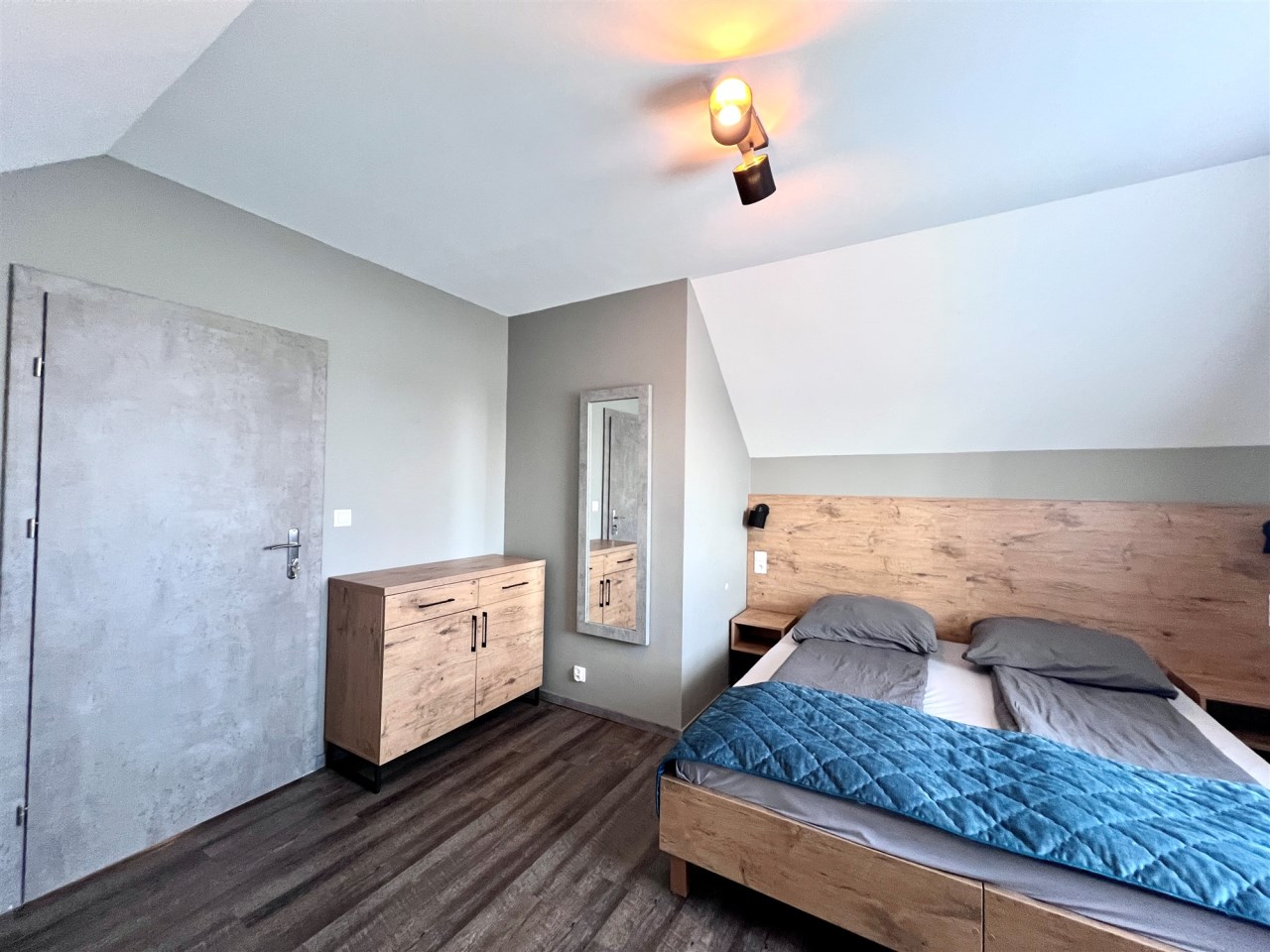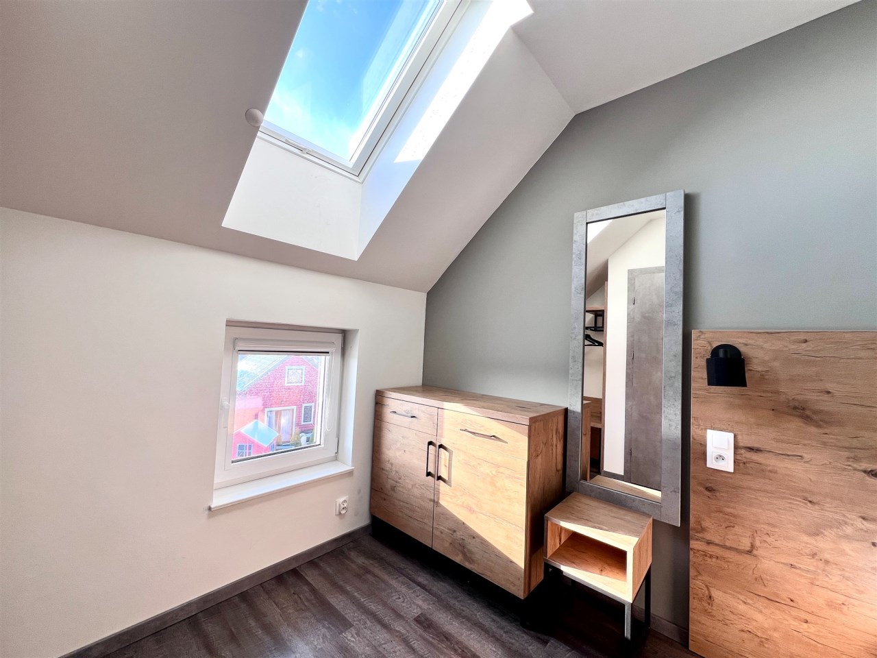Apartament składa się z dwóch poziomów. Na parterze znajduje się obszerny salon z aneksem kuchennym oraz łazienka, natomiast na piętrze czekają dwie przytulne sypialnie, zapewniające komfortowy wypoczynek. Całość jest w pełni umeblowana i wyposażona – możesz od razu wprowadzić się lub rozpocząć wynajem bez dodatkowych inwestycji.